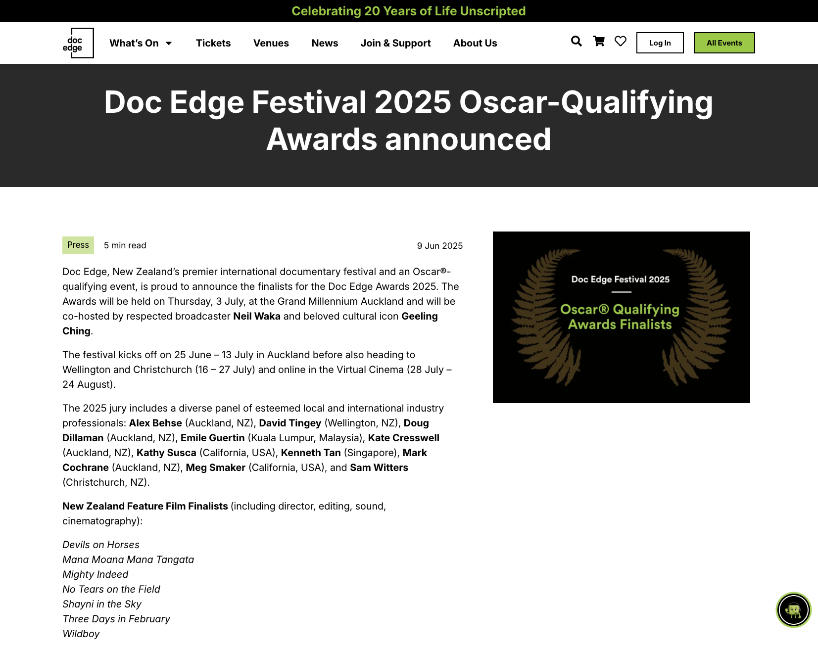 Doc Edge, New Zealand’s premier international documentary festival and an Oscar®-qualifying event, is proud to announce the finalists for the Doc Edge Awards 2025. The Awards will be held on Thursday, 3 July, at the Grand Millennium Auckland and will be co-hosted by respected broadcaster Neil Waka and beloved cultural icon Geeling Ching.
